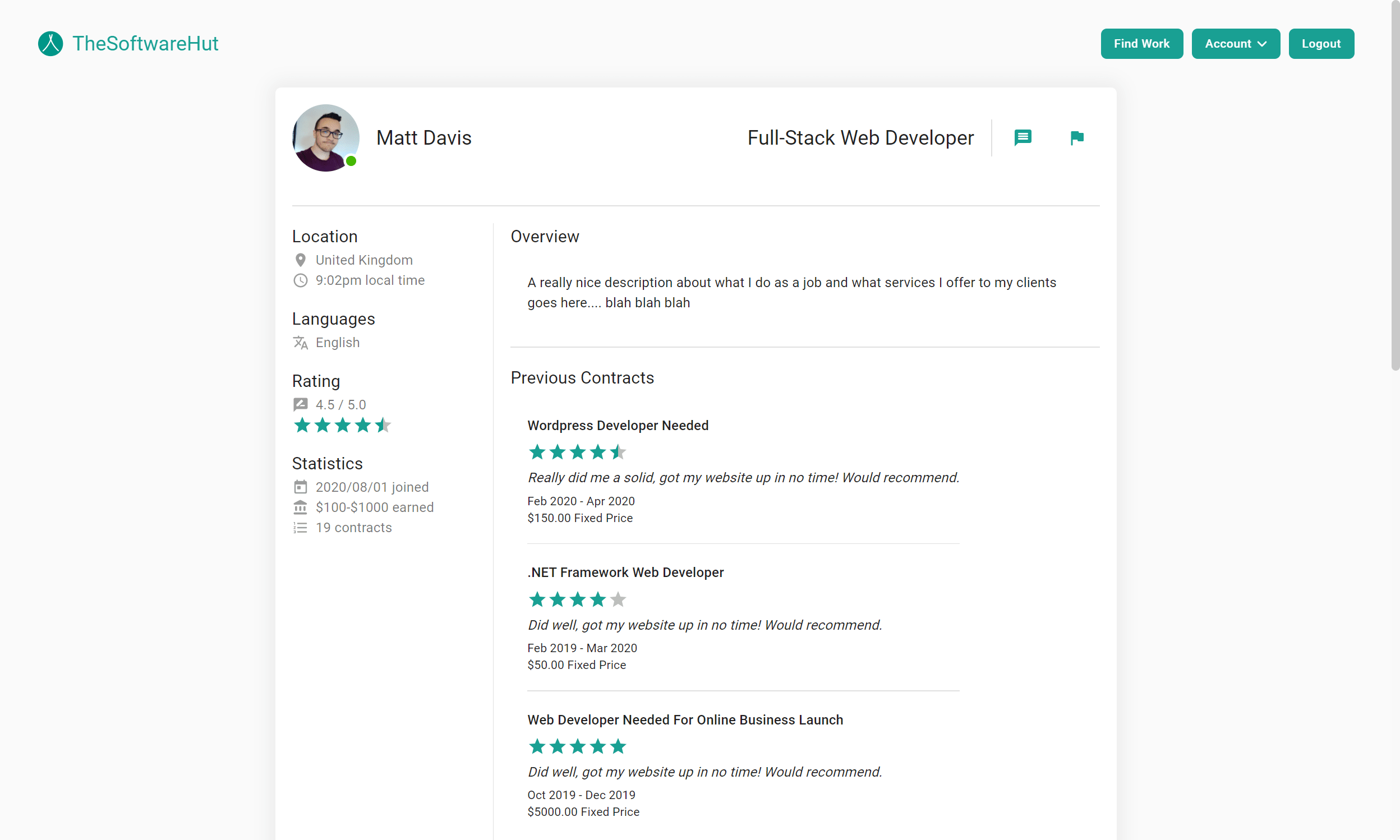 A freelance platform for the IT industry. The platform provides the ability to advertise work contracts that are secured by an escrow system, ensuring both freelancers and clients peace of mind for payments. Instant messaging is built into the platform using Socket.io. This project is a work-in-progress.